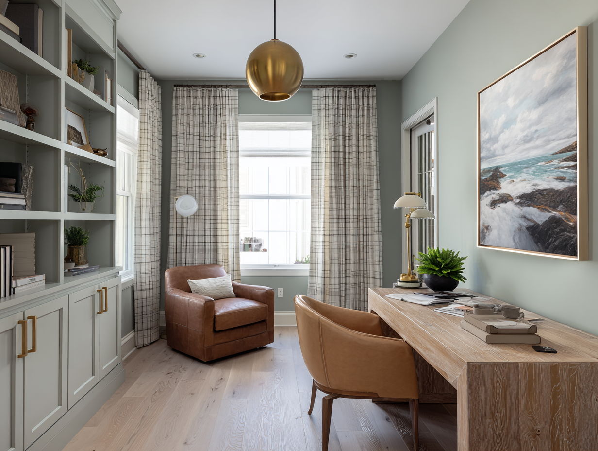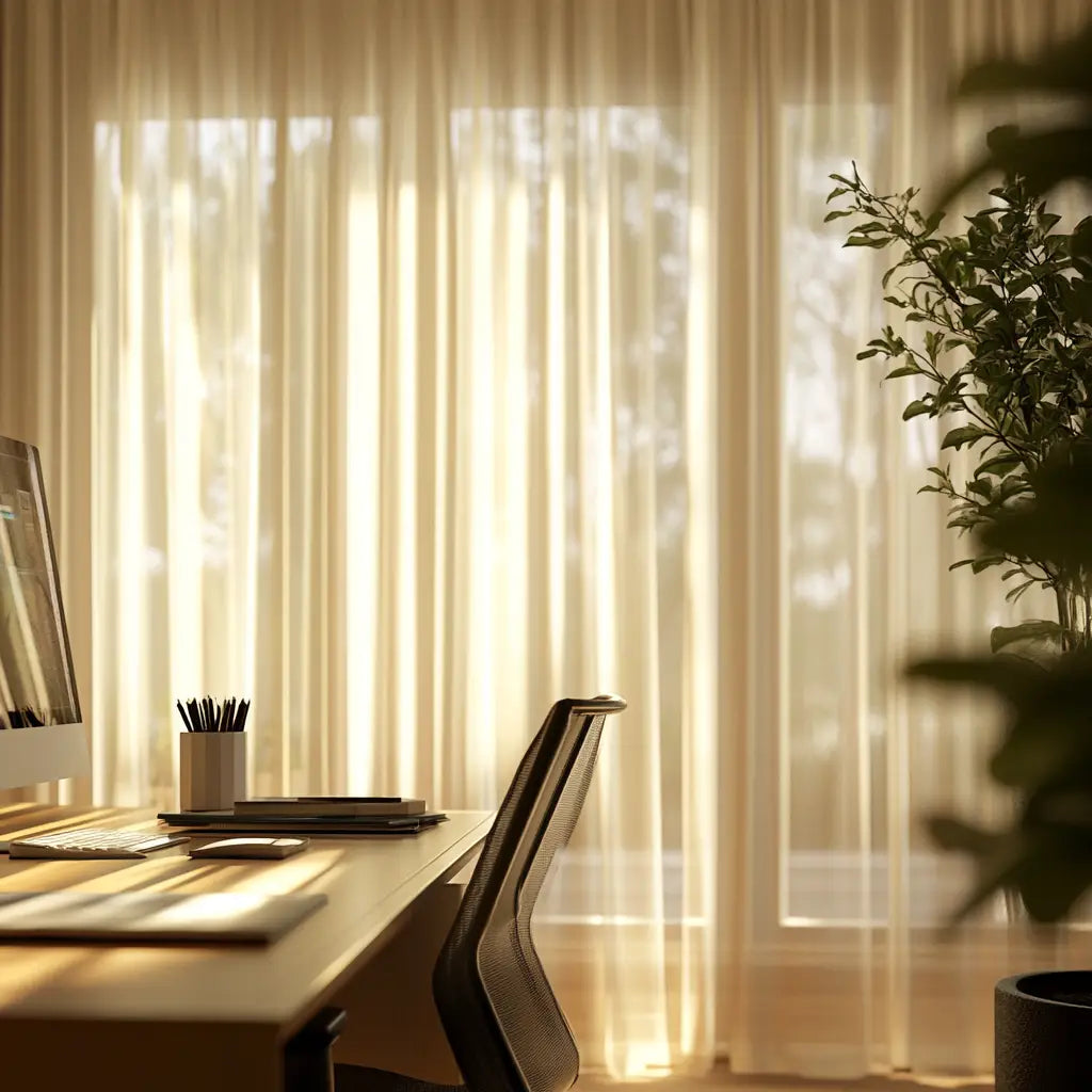 Suggested Visuals: A stylish home office with natural light filtered through elegant drapes