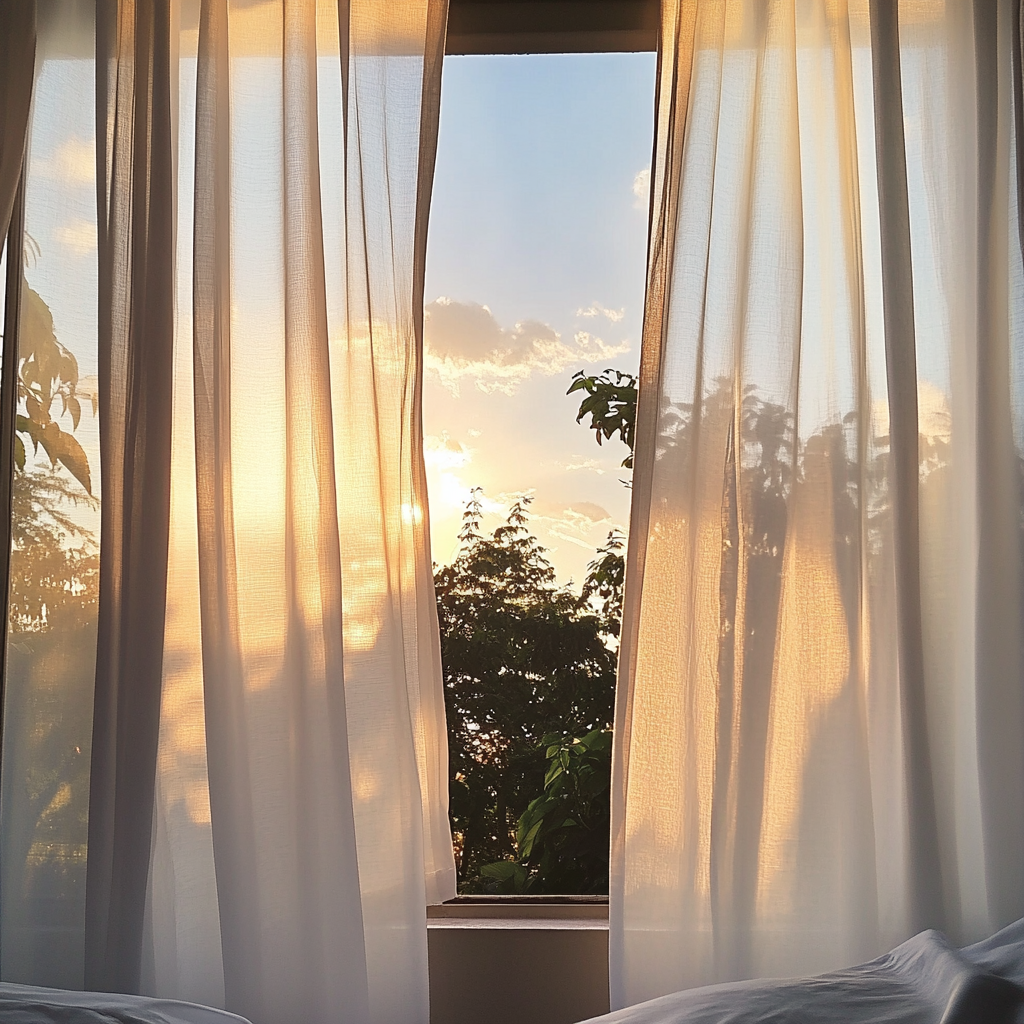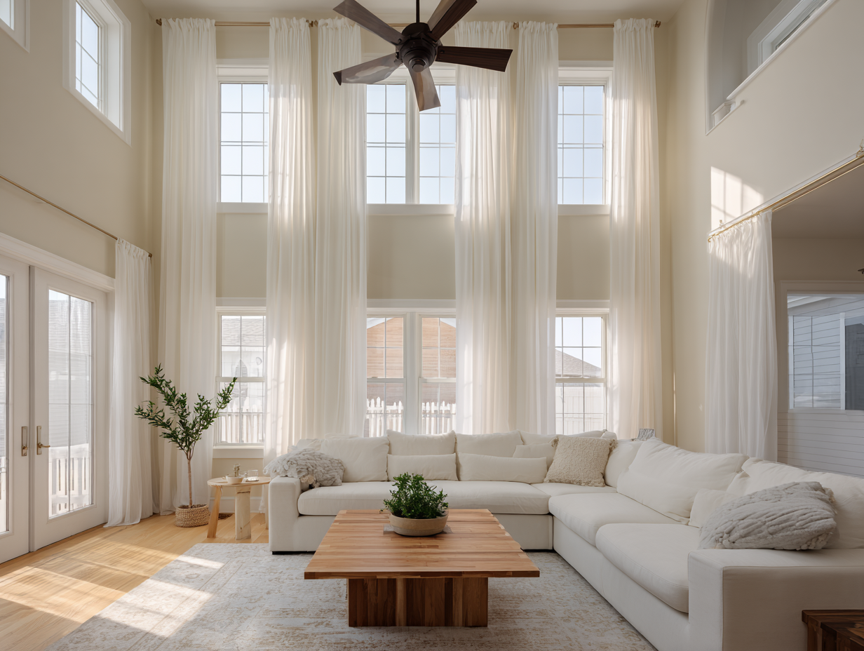 Suggested Visuals: A bright, sunlit living room with flowing drapes framing a large window